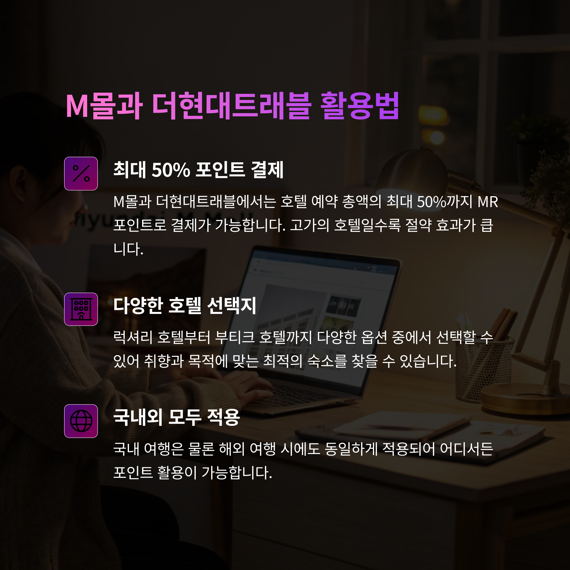 현대카드의 MR 포인트는 단순한 카드 적립 혜택을 넘어, 실질적인 여행 비용 절감을 가능하게 합니다. 특히 M몰과 더현대트래블 플랫폼에서는 호텔 가격의 최대 50%까지 포인트로 결제할 수 있어, 현금 부담을 줄이면서도 고급스러운 숙박을 즐길 수 있습니다. MR 포인트는 일정 이상 적립 시, 글로벌 호텔 체인의 포인트로도 전환 가능하여 힐튼, 메리어트 등 전 세계 수많은 호텔에서 자유롭게 사용할 수 있는 장점이 있습니다.