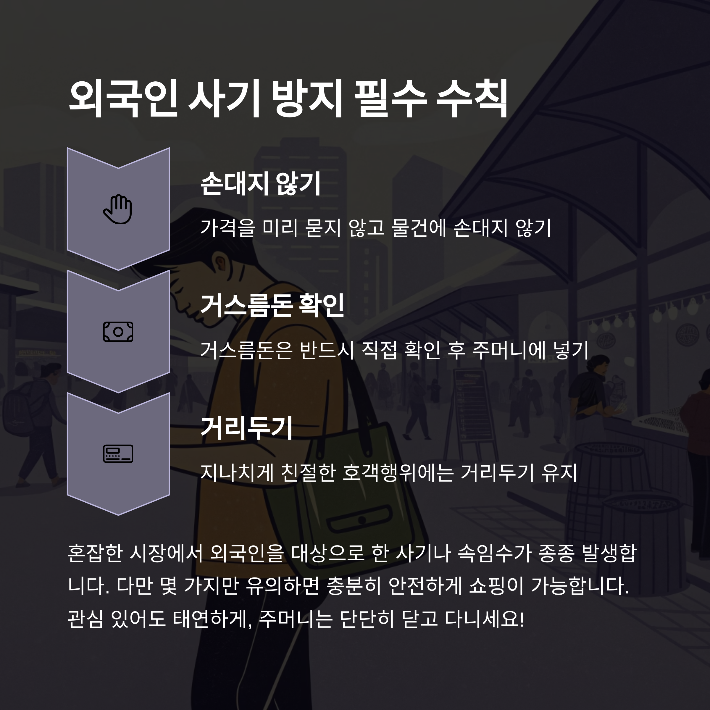 혼잡한 시장에서 외국인을 대상으로 한 사기나 속임수가 종종 발생합니다.