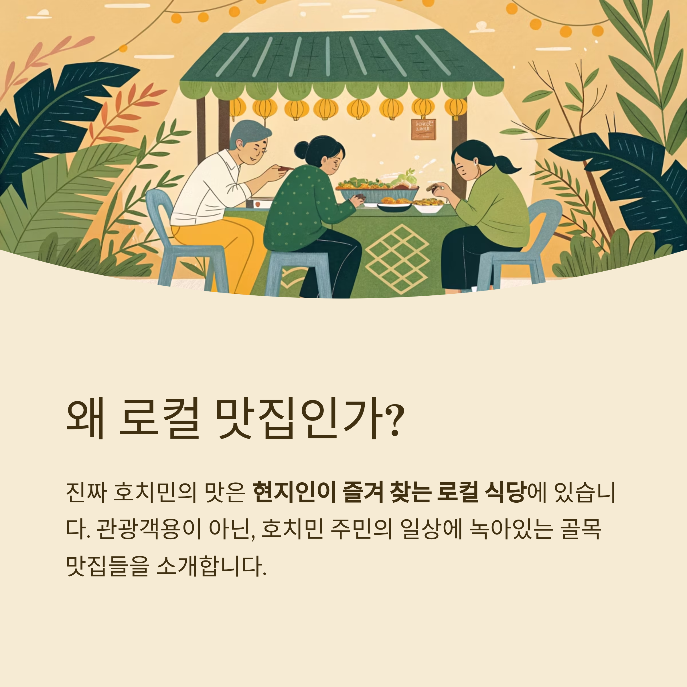 관광객용 상업 식당이 아닌, 호치민 주민의 일상에 녹아 있는 골목 맛집들을 중심으로 구성했습니다.