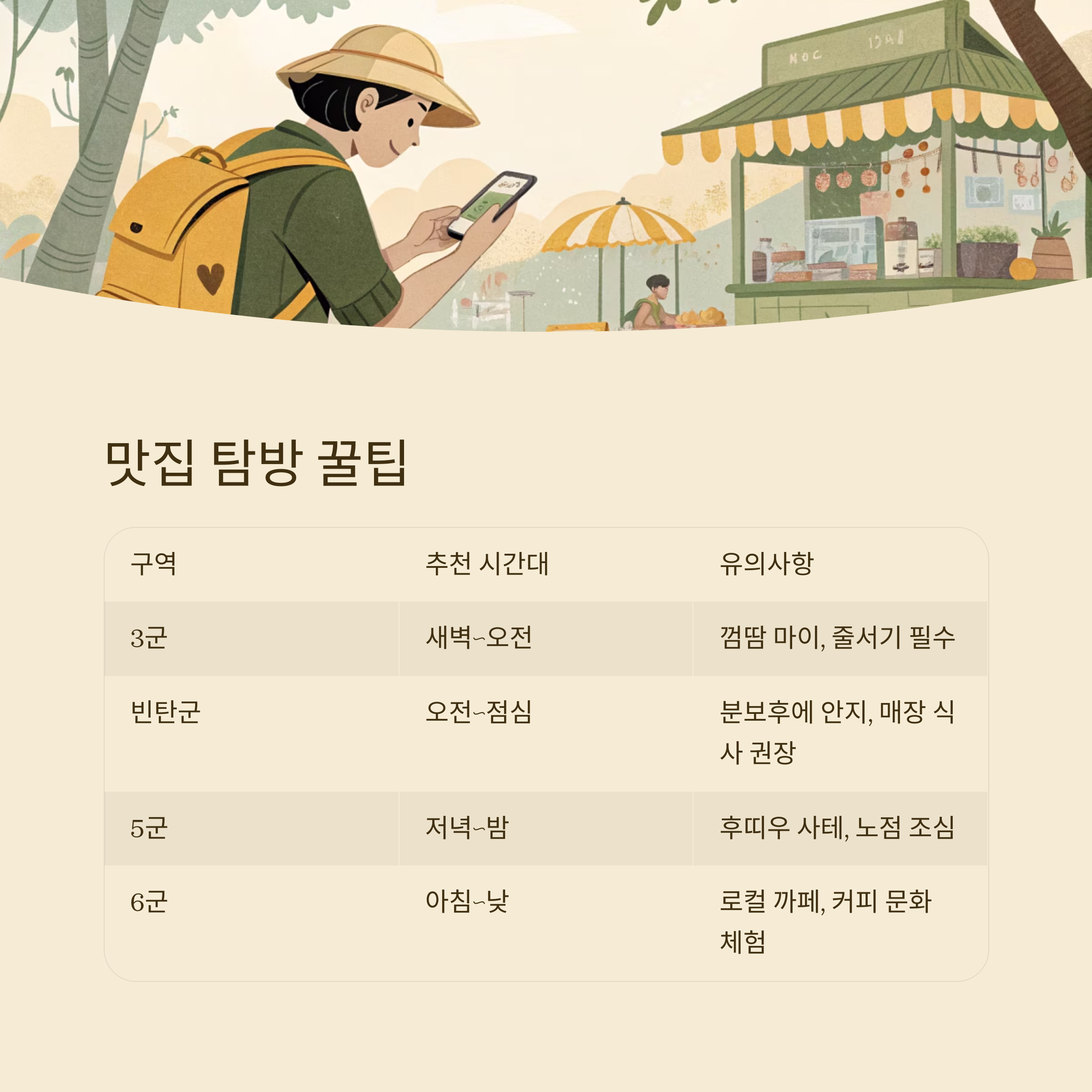 | 3군 | 새벽~오전 | 껌땀 마이, 줄서기 필수 |
