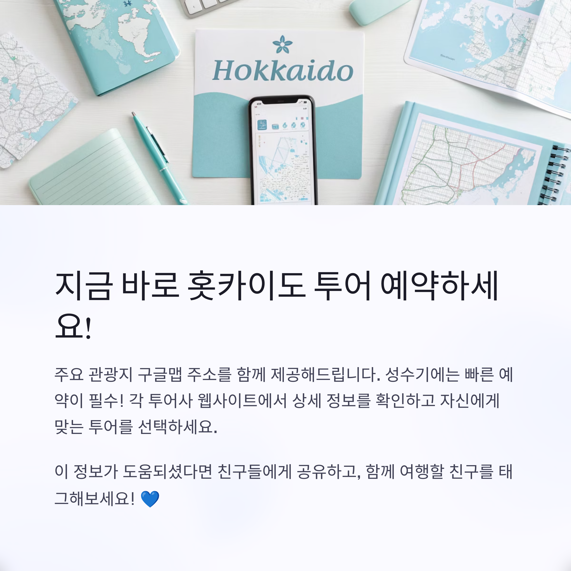 투어 옵션은 최적의 여행 경험을 제공하며, 시간을 절약하고 더 많은 장소를 방문하는 데 도움을 줍니다. 투어 혜택과 프로모션을 비교하여 예산에 맞는 최선의 옵션을 선택하세요. 구글맵 주소를 활용하면 장소를 쉽게 찾아가며 투어 일정에도 차질이 생기지 않습니다. 후라노와 비에이의 자연은 계절마다 색다른 매력을 선사하니, 방문하는 시기에 따라 아름다운 풍경을 만끽해보세요. 여행을 계획할 때 꼭 필요한 정보를 참고하여 잊지 못할 여행을 만들어보세요!