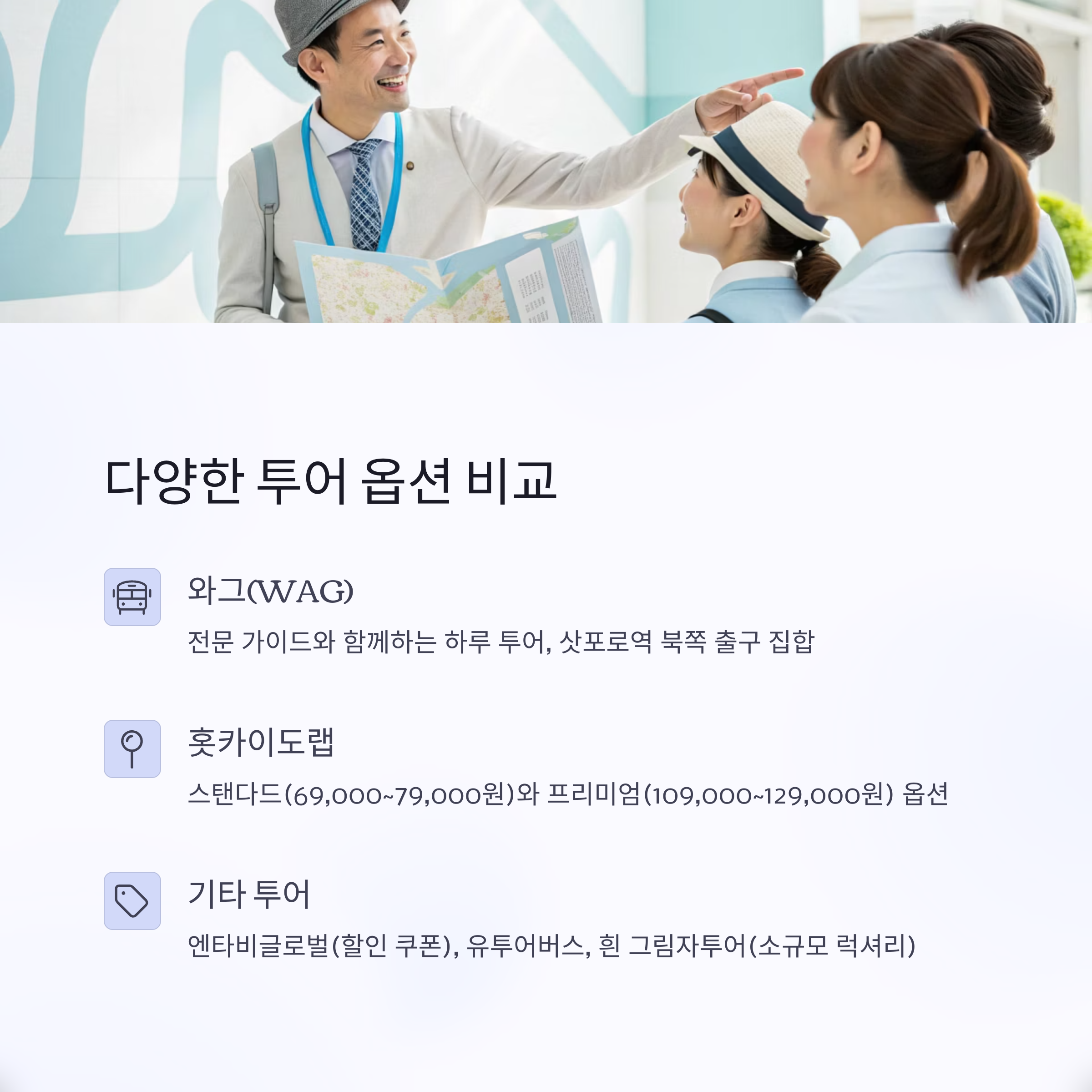 와그(하루하루투어)의 장점은 최소 1명부터 출발 가능하다는 점으로 혼자 여행하는 분들에게 적합합니다. 여행자들의 편의를 위해 각 투어의 미팅 장소와 구글맵 주소까지 제공되므로, 찾아가는 데 어려움이 없습니다. 이러한 투어는 비에이의 청의 호수, 후라노의 닝구르 테라스와 같은 아름다운 명소를 반드시 포함하고 있어 만족도가 높습니다.