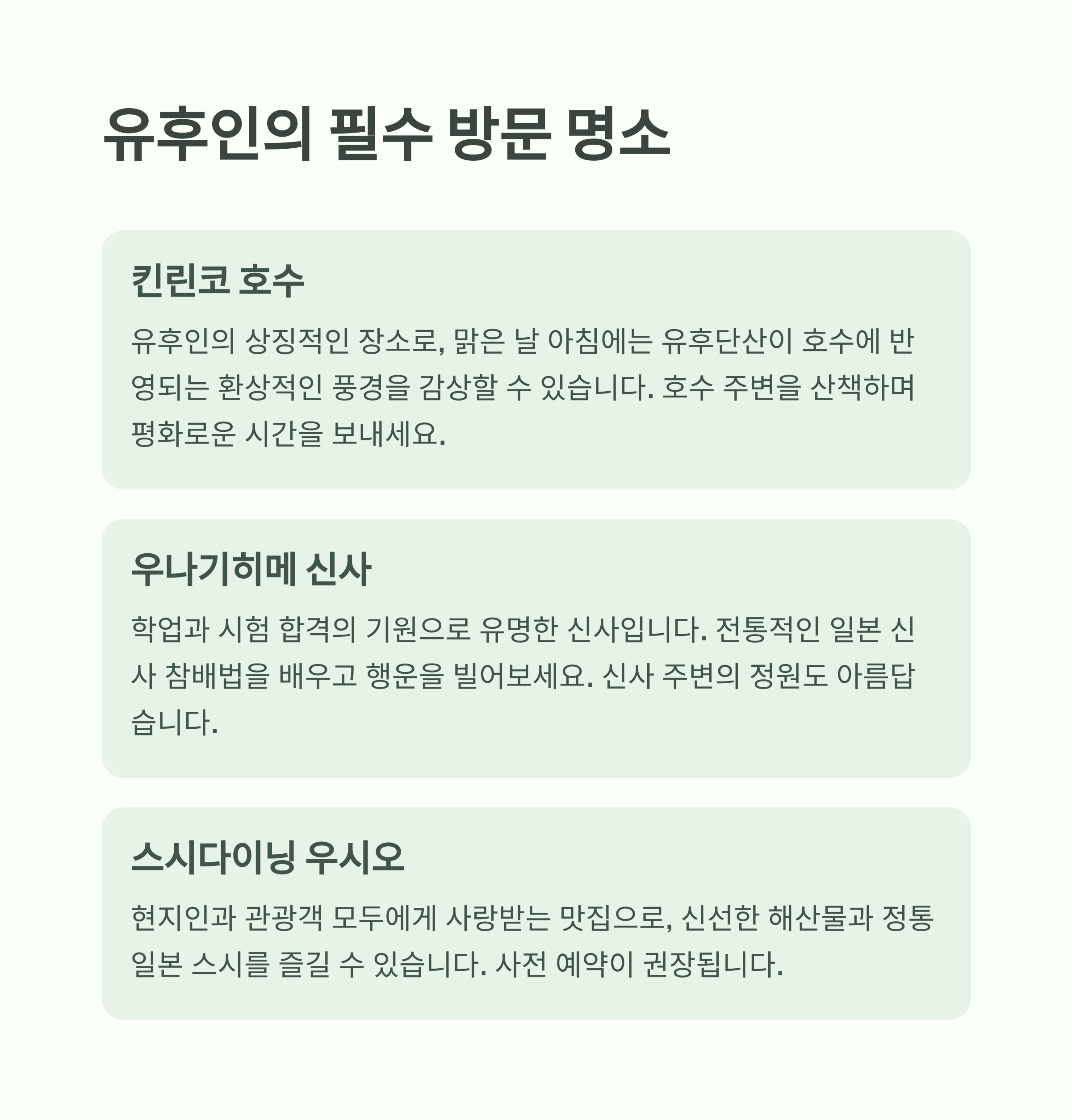 유후인의 주요 명소는 대체로 호수 주변에 위치해 있어 동선을 짜기 용이합니다. 아침 일찍 킨린코 호수를 방문하면 물안개의 아름다운 절경을 감상할 수 있습니다. 이후 우나기히메 신사를 들려 일본 전통 신사의 분위기를 느껴보는 것이 좋습니다.