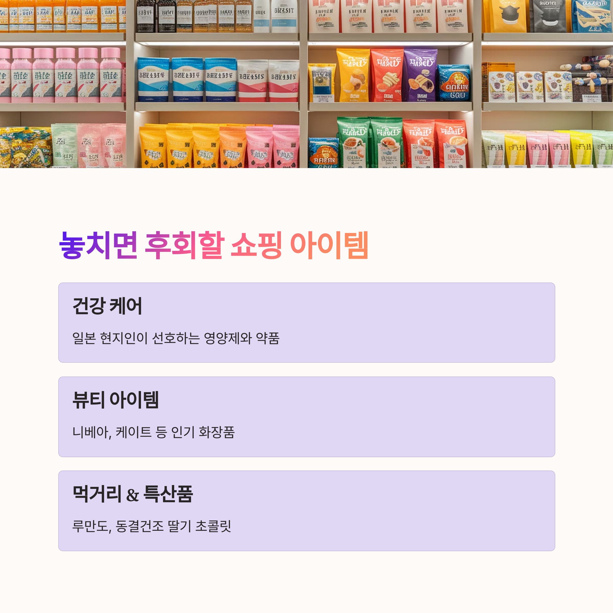 심야 쇼핑을 해야 한다면 24시간 운영되는 이곳이 완벽한 선택입니다. 일본 현지에서만 구매 가능한 베스트템을 경험해 보세요.