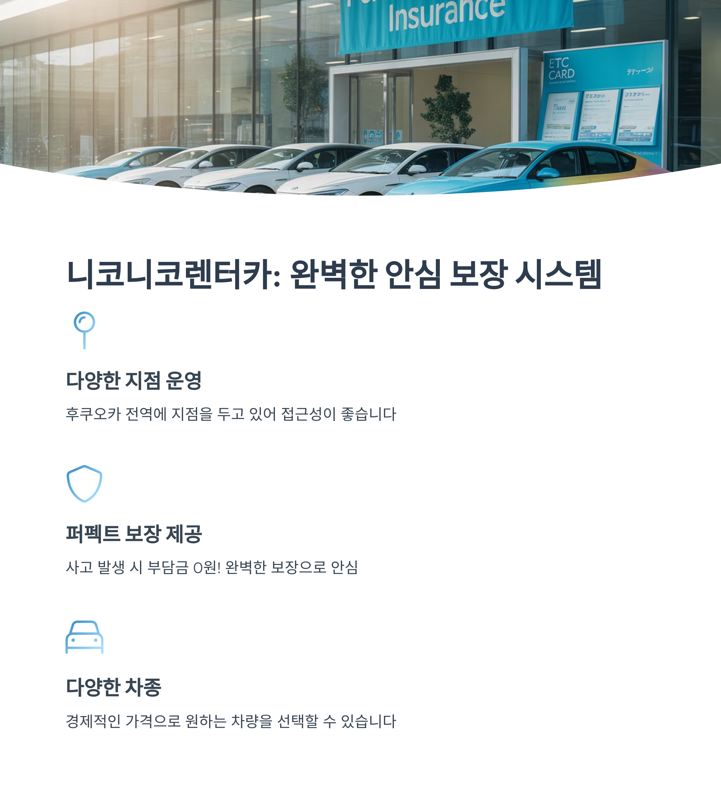 니코니코렌터카는 사고 부담금이 없도록 보장하는 퍼펙트 보장 옵션을 제공하며, ETC 카드 무료 대여도 가능합니다.