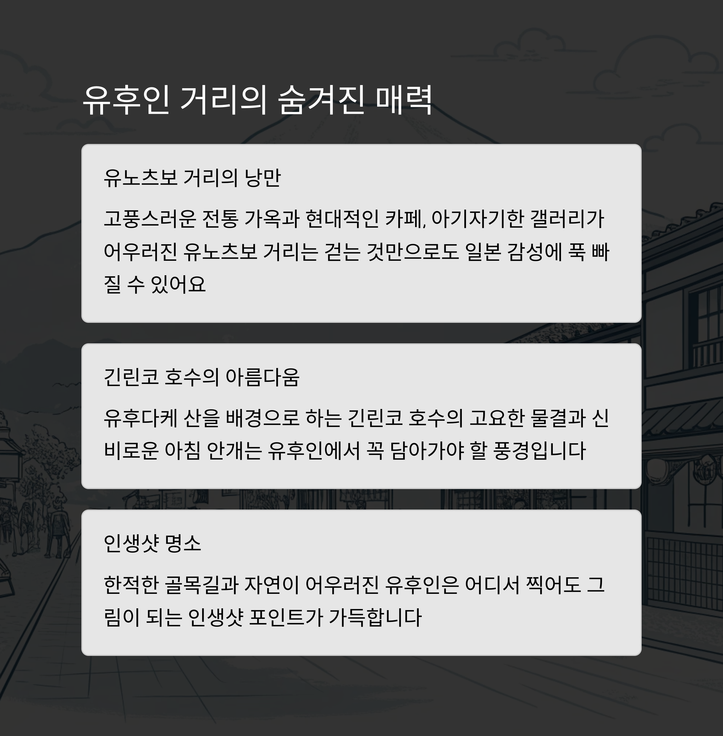 특히 유후인 호수 주변 산책은 잊을 수 없는 기억이 되었어요