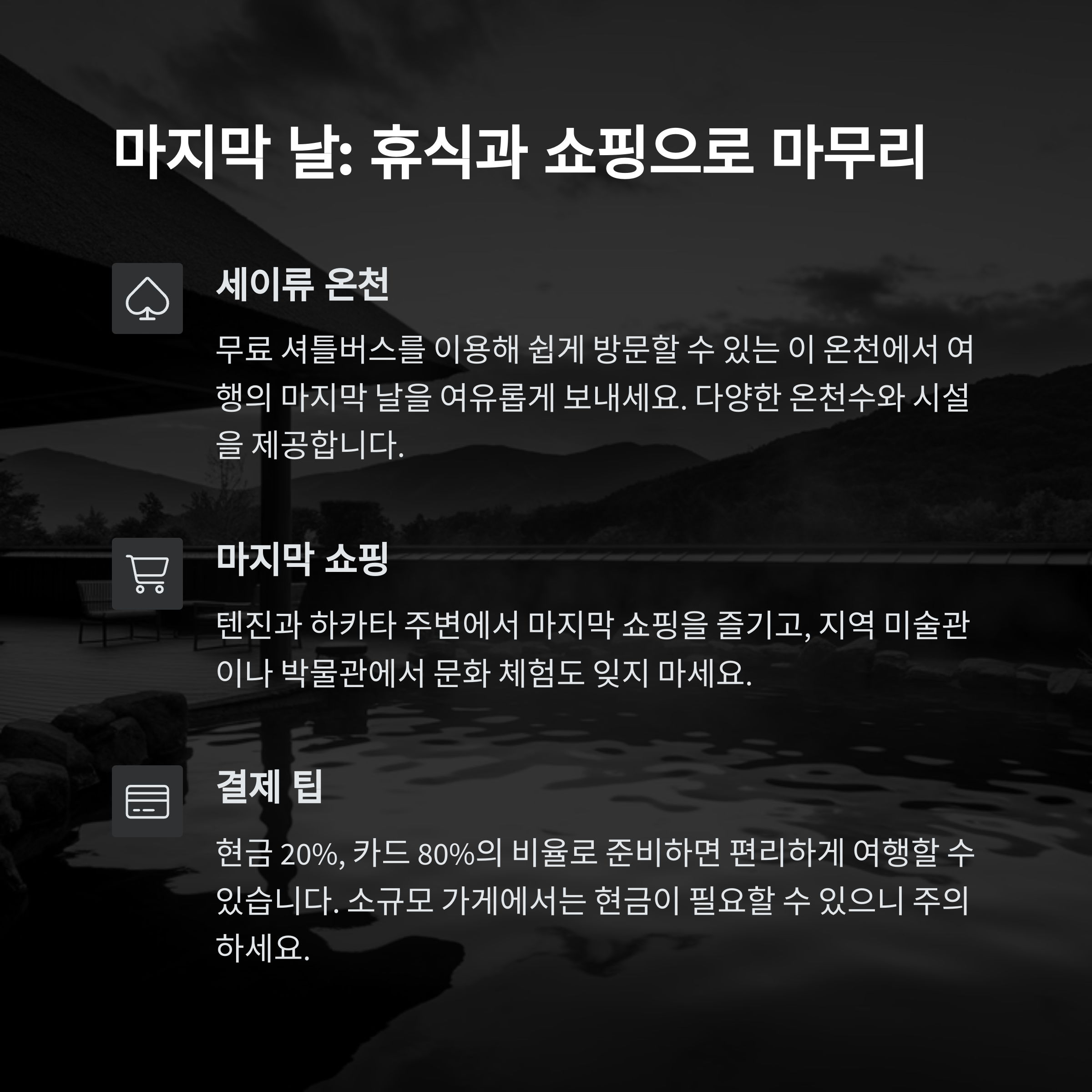특히 일본 전통 온천과 지역 문화 체험은 마음껏 즐길 수 있도록 충분한 시간을 계획해 보세요. 교통비 및 기념품 구매도 미리 예산에 포함하면 더 나은 여행 준비가 가능합니다. 마지막 날에는 온천에서 편안히 마무리하며 일정을 마칠 수 있습니다.