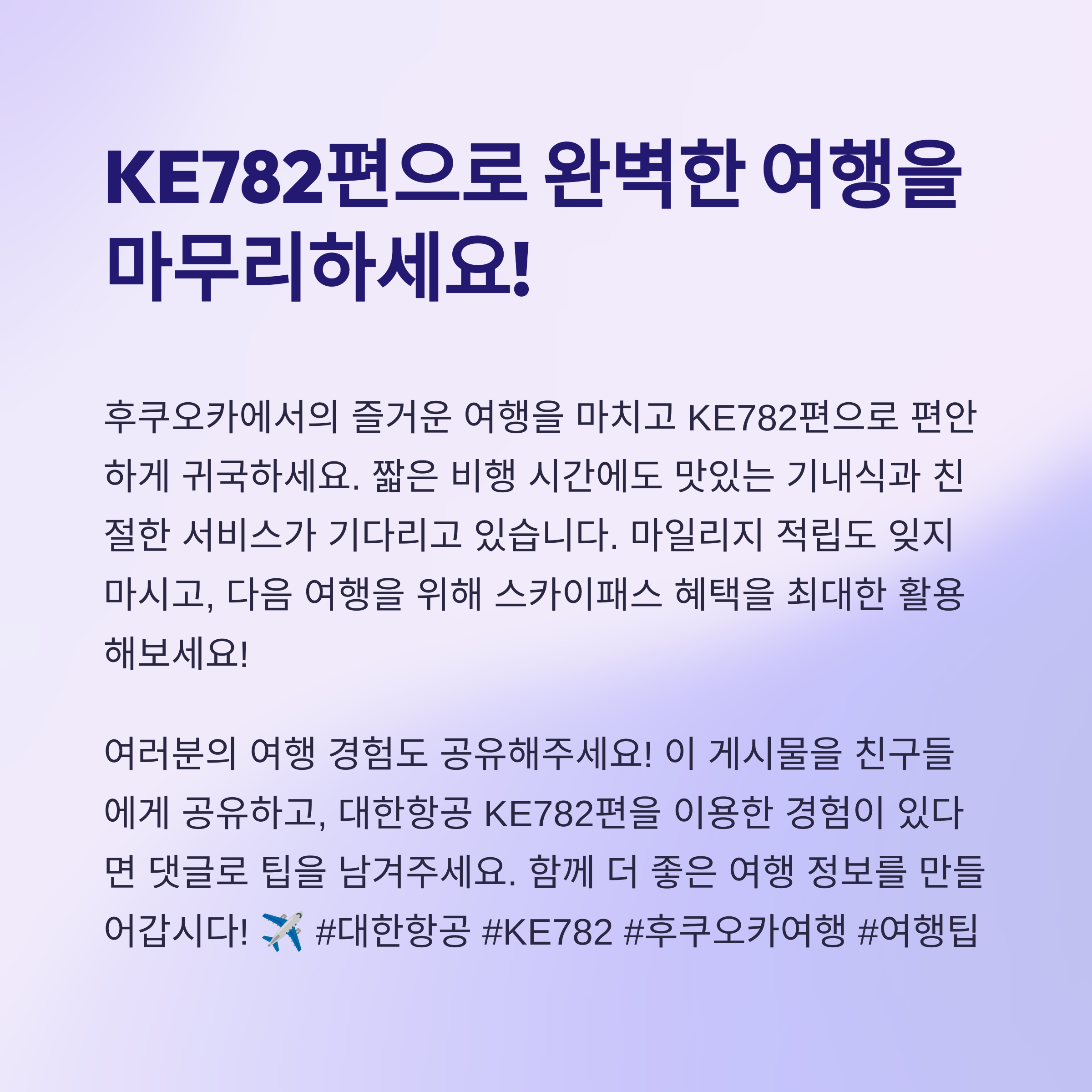 다음 여행에서 더욱 편리하고 만족스러운 항공 경험을 원하신다면, KE782편은 탁월한 선택이 될 것입니다.