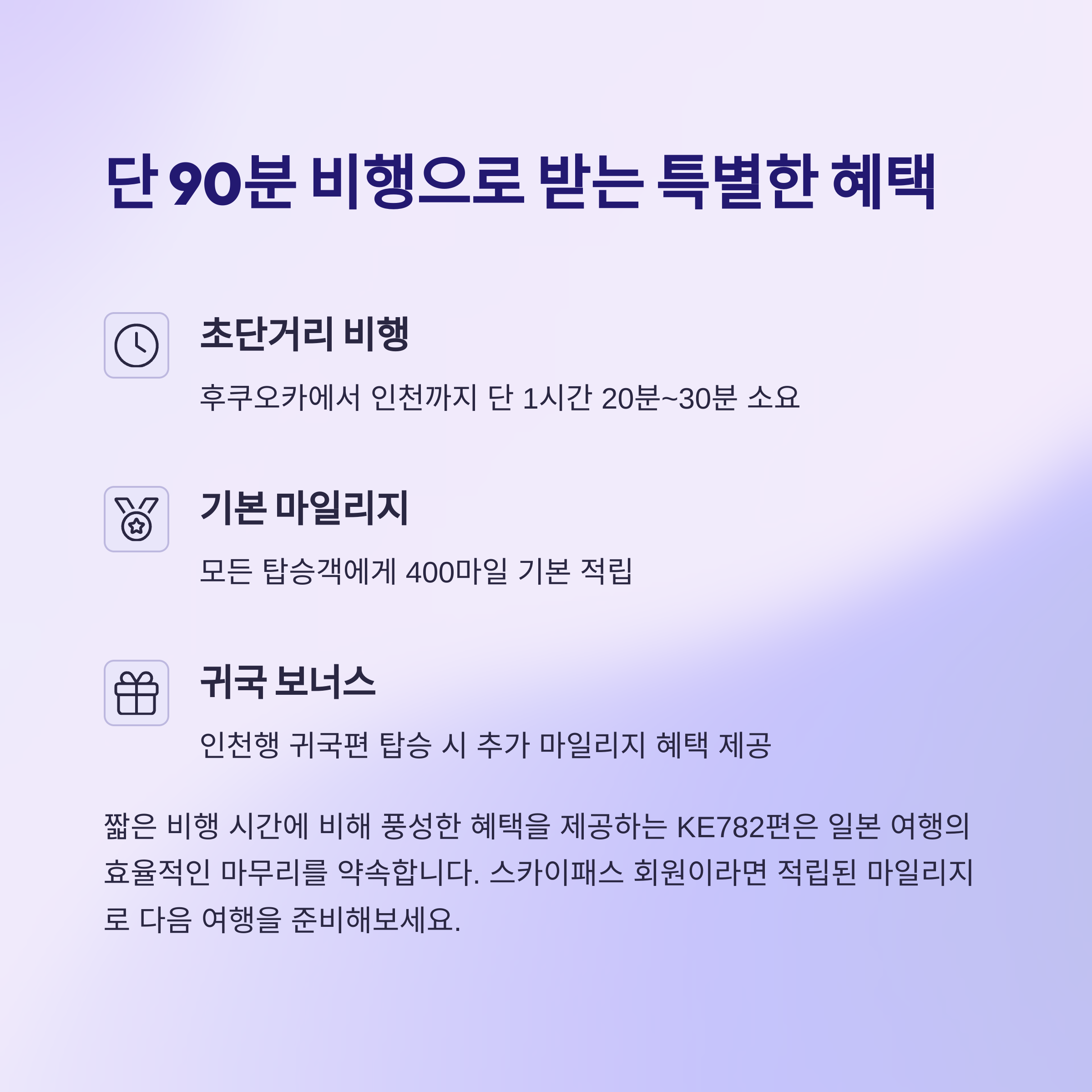 대한항공 KE782편은 후쿠오카에서 인천으로 이동하기에 최적의 선택 중 하나입니다.