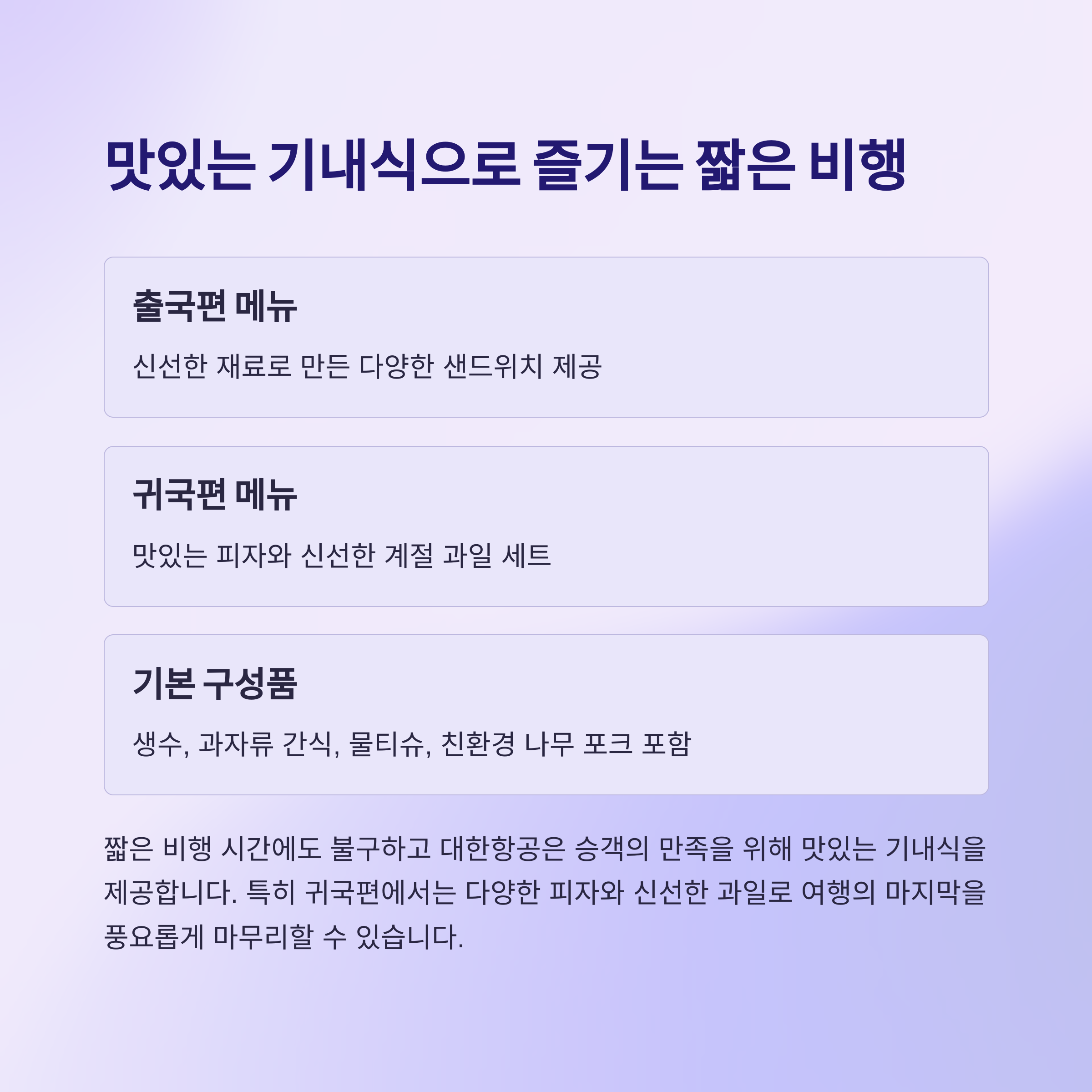 기내식 메뉴는 짧은 비행 시간에 적합하게 설계되어, 편리한 간식을 즐길 수 있습니다.