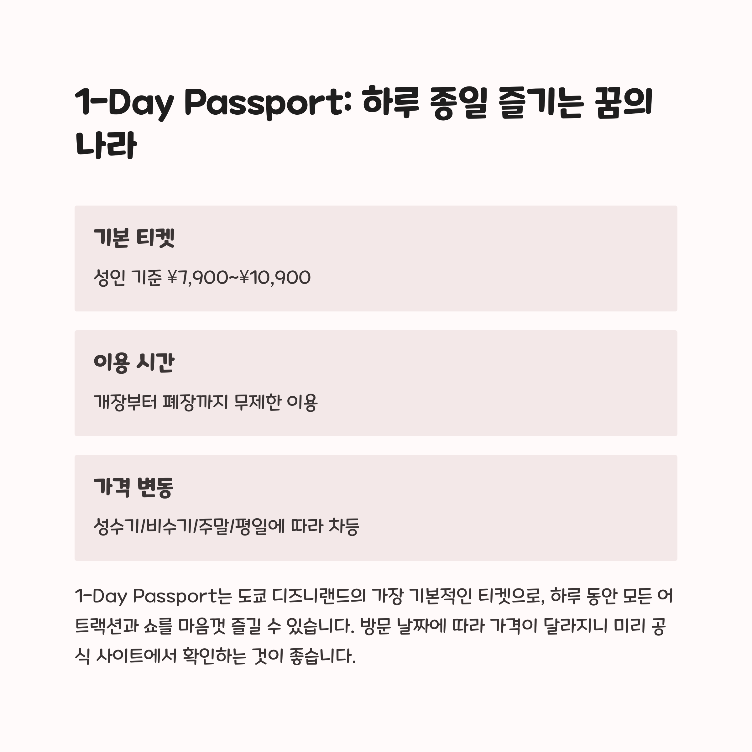 | 도쿄 디즈니 티켓 | 티켓 종류와 가격대를 미리 파악하세요. |