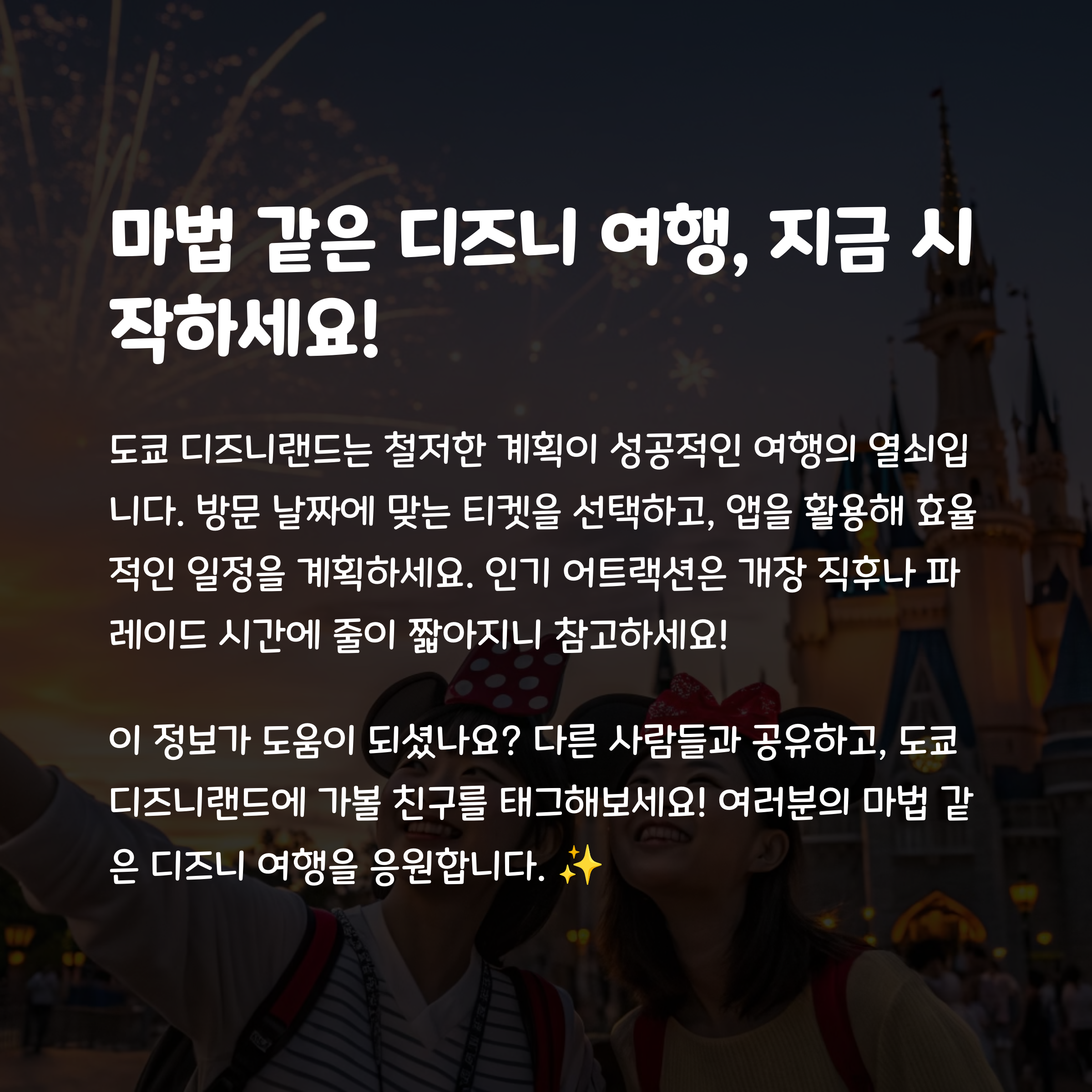 도쿄 디즈니랜드에 방문하신 경험이 있으신가요? 할인 팁이나 패스 활용 꿀팁이 있다면 댓글로 공유해주세요. 여러분의 경험이 다른 분들에게도 큰 도움이 됩니다!