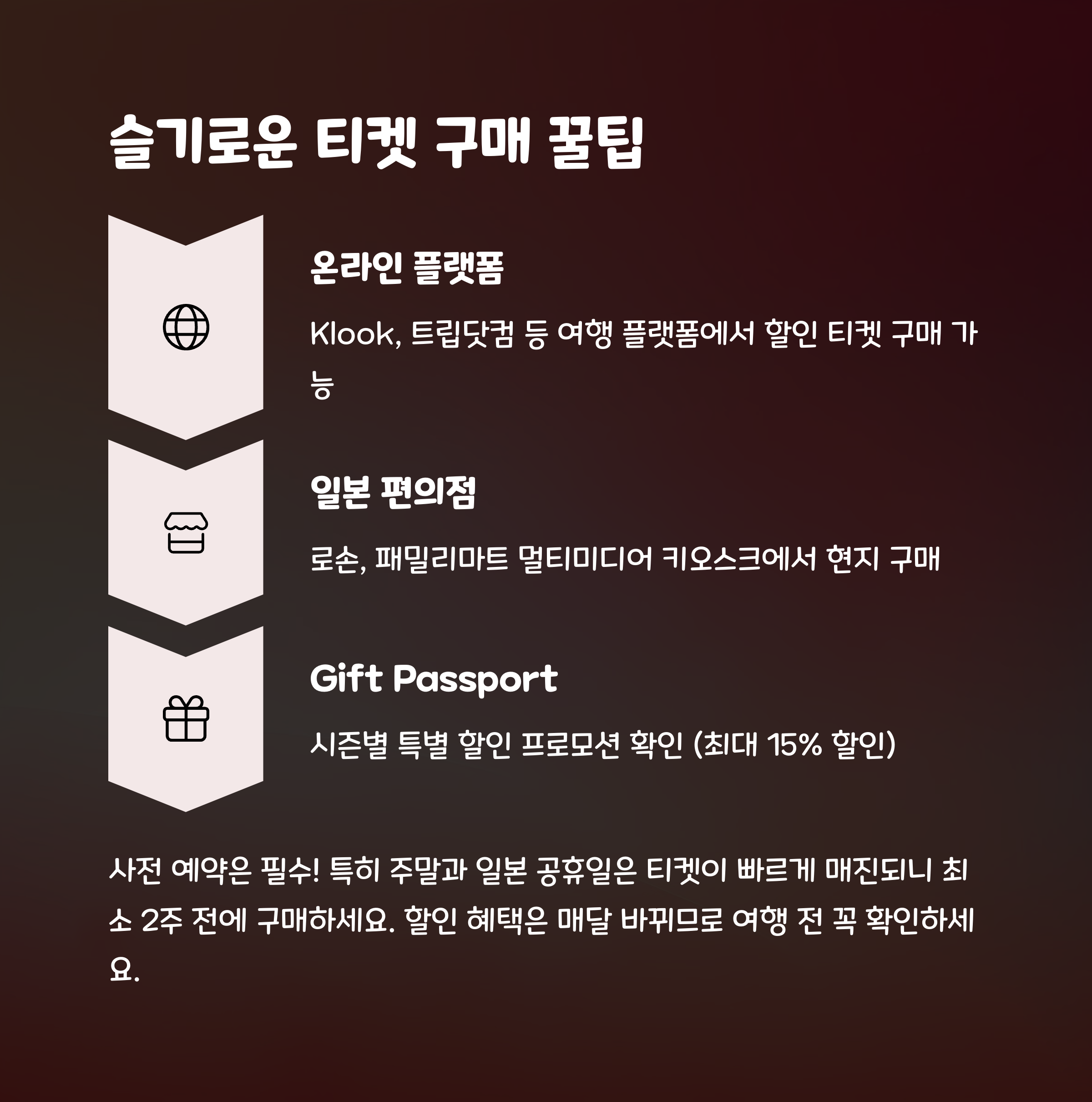 할인 티켓을 구매하려면 인증된 플랫폼을 활용하는 것이 중요합니다. 예를 들어 Klook 같은 사이트에서는 해외 신용카드 결제가 용이하며, QR 코드로 간편하게 티켓을 앱에 저장하고 사용할 수 있어 편리합니다. 일본 현지에서는 편의점(로손, 패밀리마트)에서 구매할 수 있는 장점도 있습니다. 특정 시즌에는 Gift Passport와 같은 특별 할인 혜택도 제공되므로, 디즈니랜드 공식 홈페이지와 할인 제휴사의 정보를 수시로 확인하는 것이 좋습니다.