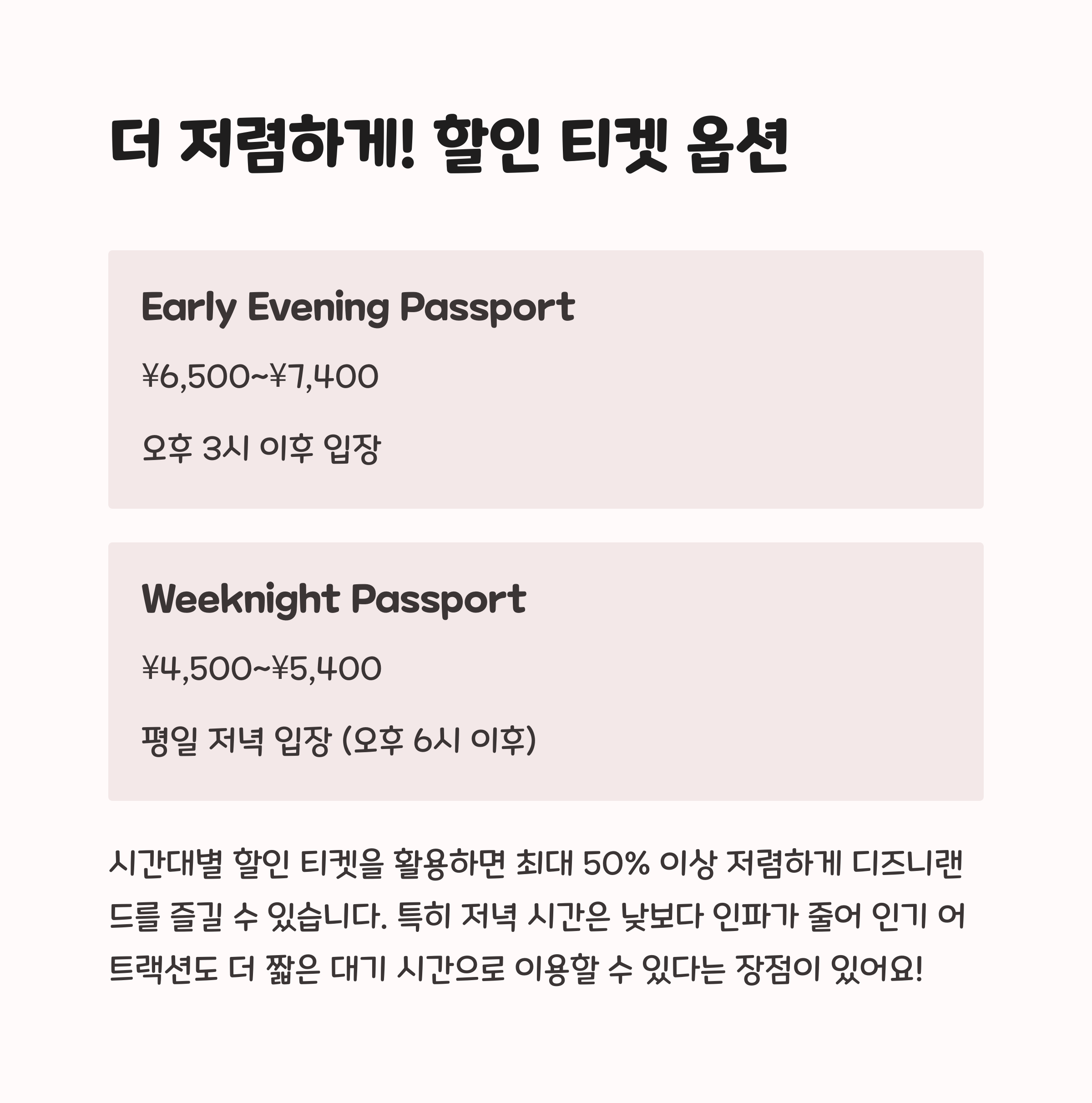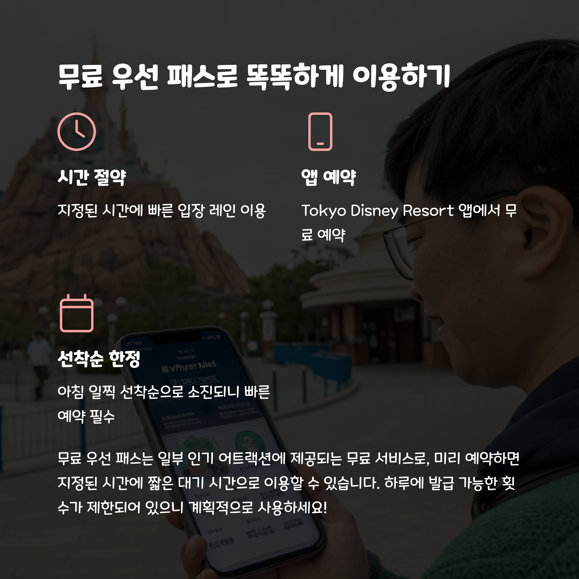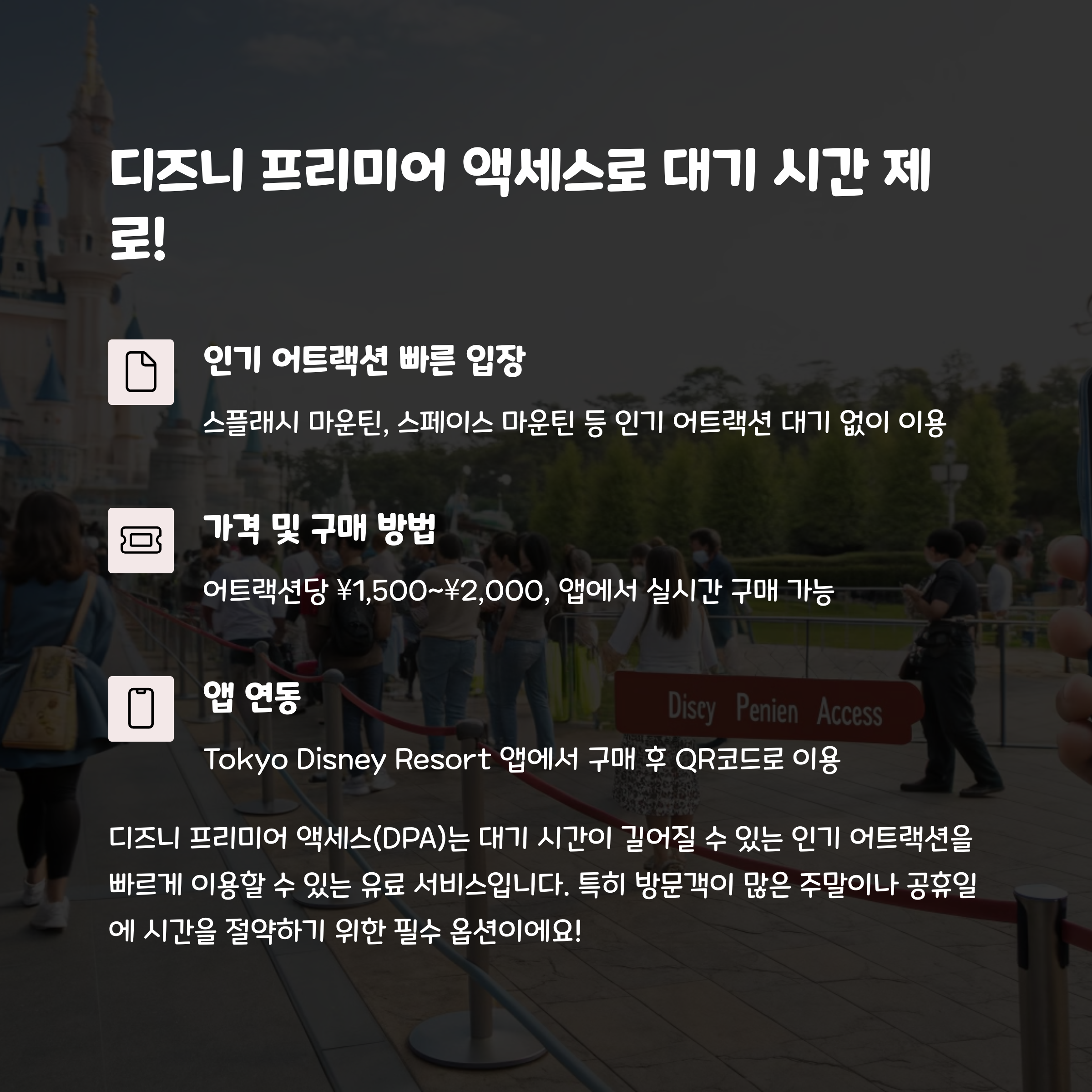 | 디즈니패스 활용법 | 줄을 서지 않고 인기 어트랙션을 즐길 수 있어요. |