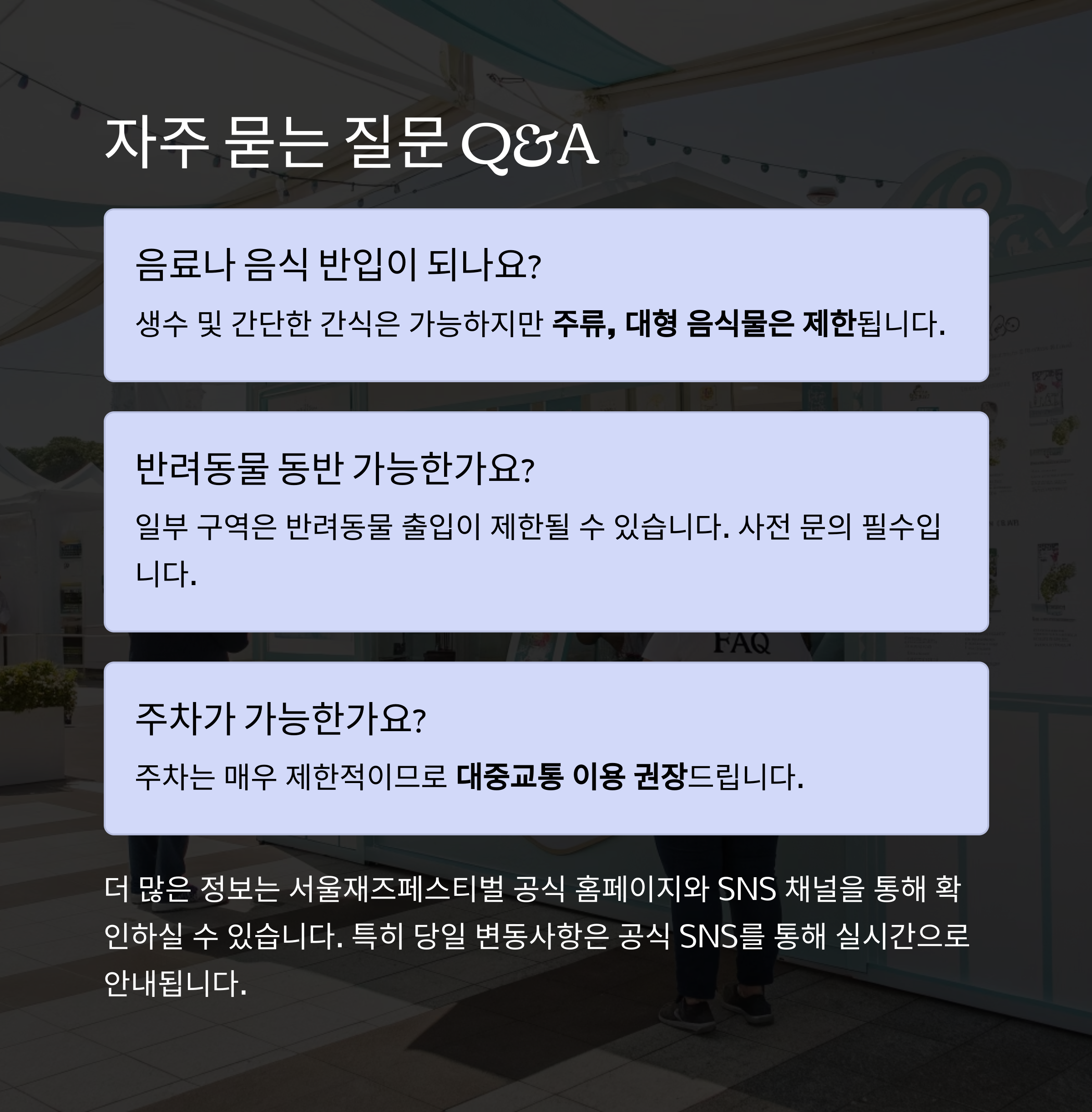 현장을 200% 즐기기 위한 모든 정보를 정리해 드립니다.