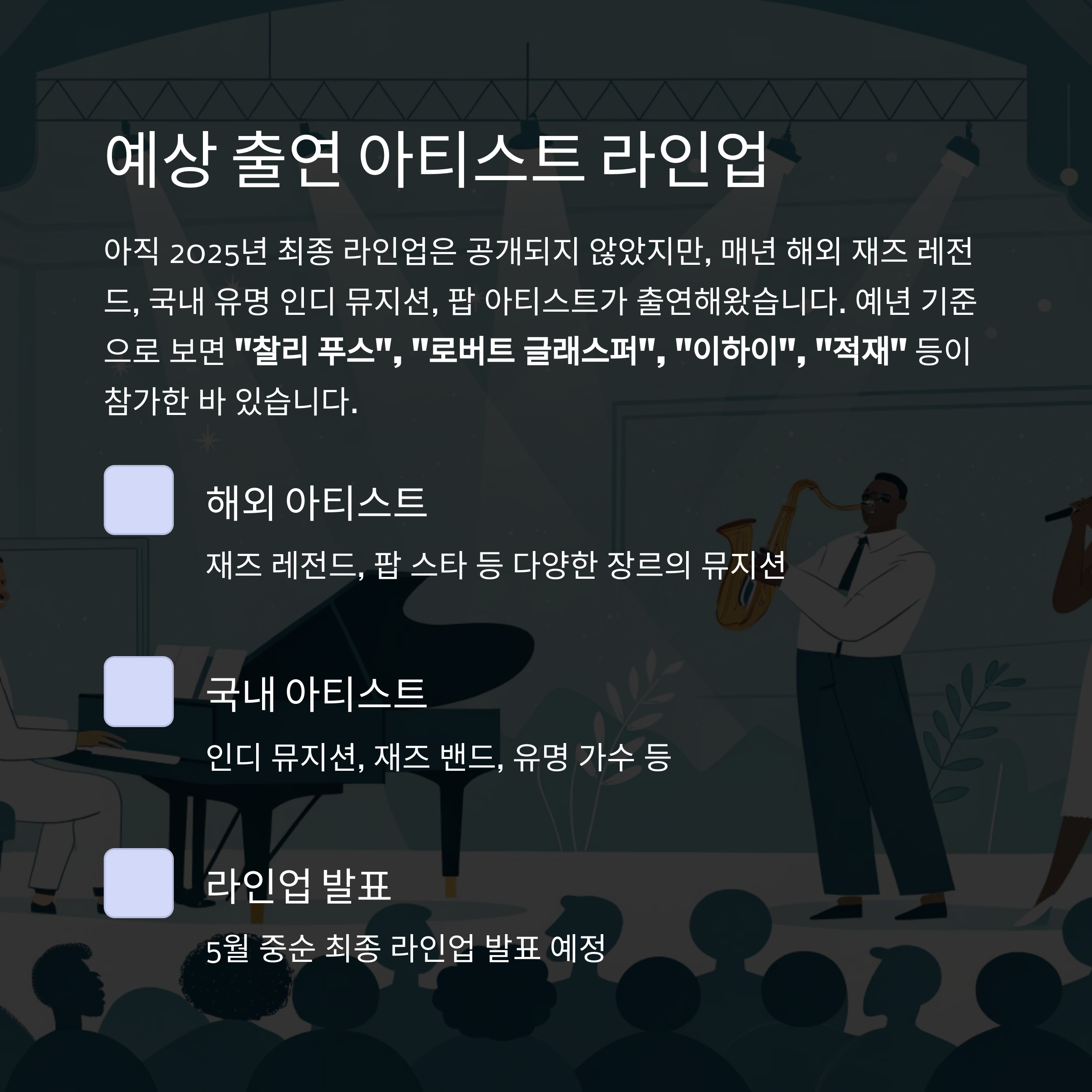 매년 해외 재즈 레전드, 국내 유명 인디 뮤지션, 팝 아티스트가 출연해왔습니다.