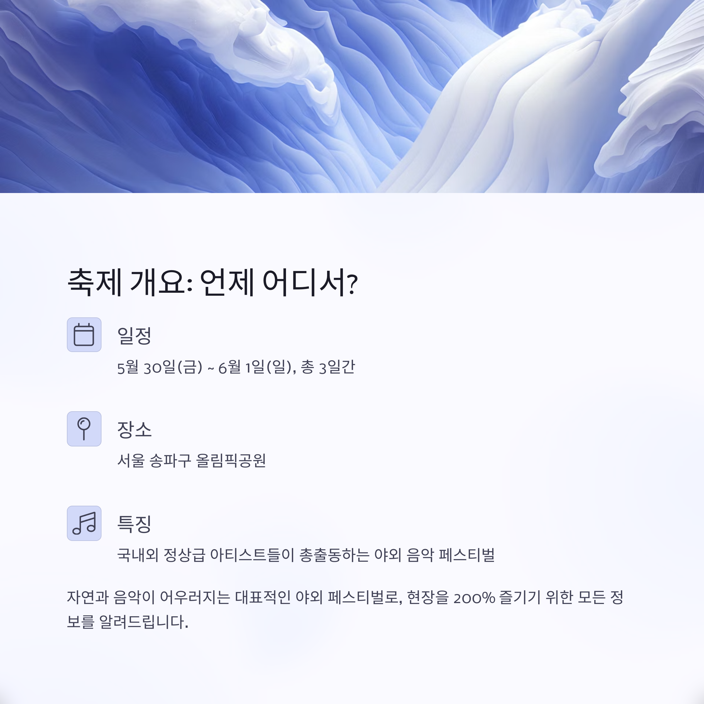 | 블루스테이지 | 잔디 위 여유로운 분위기 | 연인, 가족 관객 |