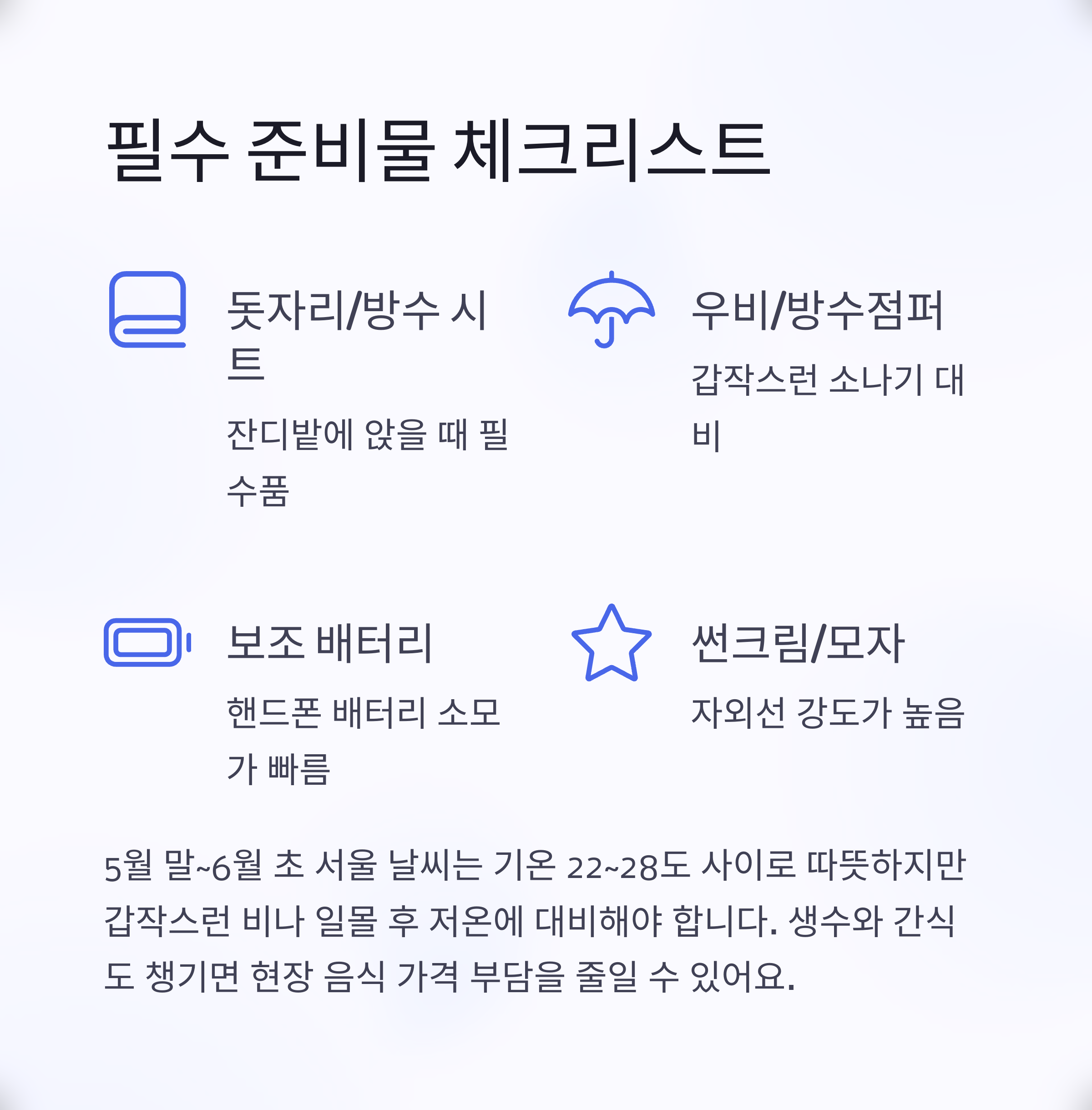 | 돗자리/방수 시트 | 잔디에 앉을 때 필수 |