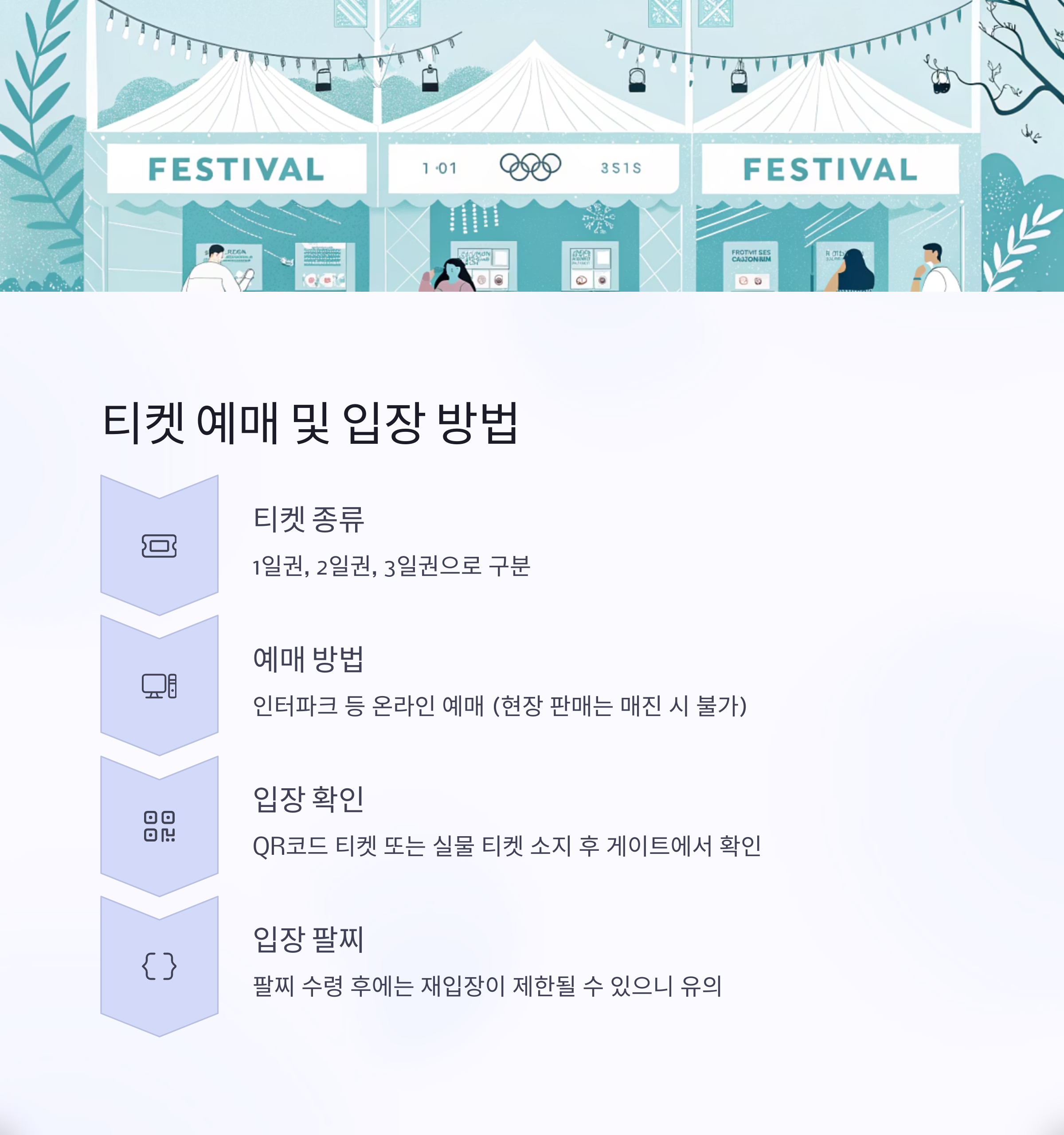 QR코드 티켓 또는 실물 티켓 소지 후, 각 구역 게이트에서 입장 확인 후 입장 가능합니다.