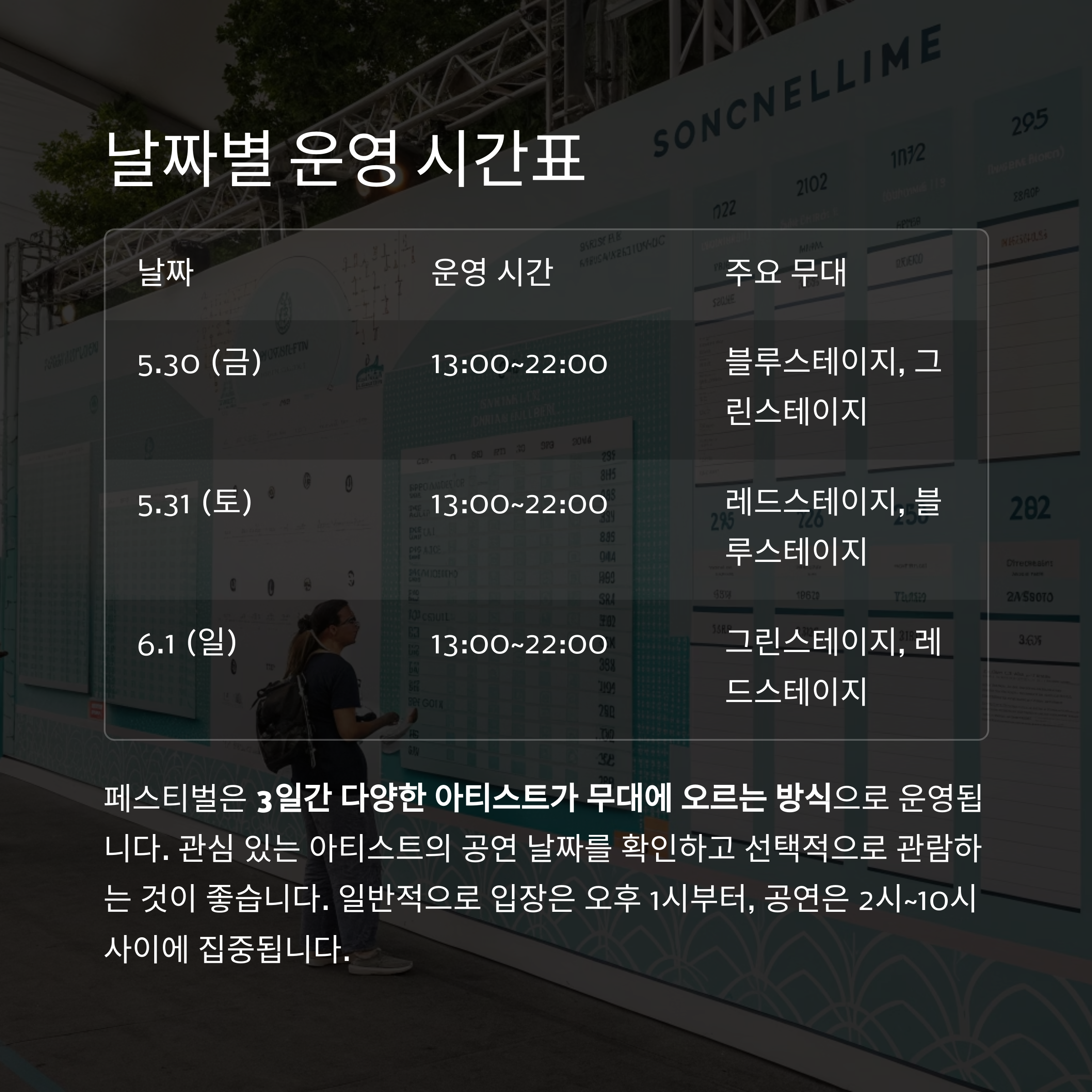 일반적으로 입장 시간은 오후 1시경, 공연은 2시~10시 사이에 집중됩니다.