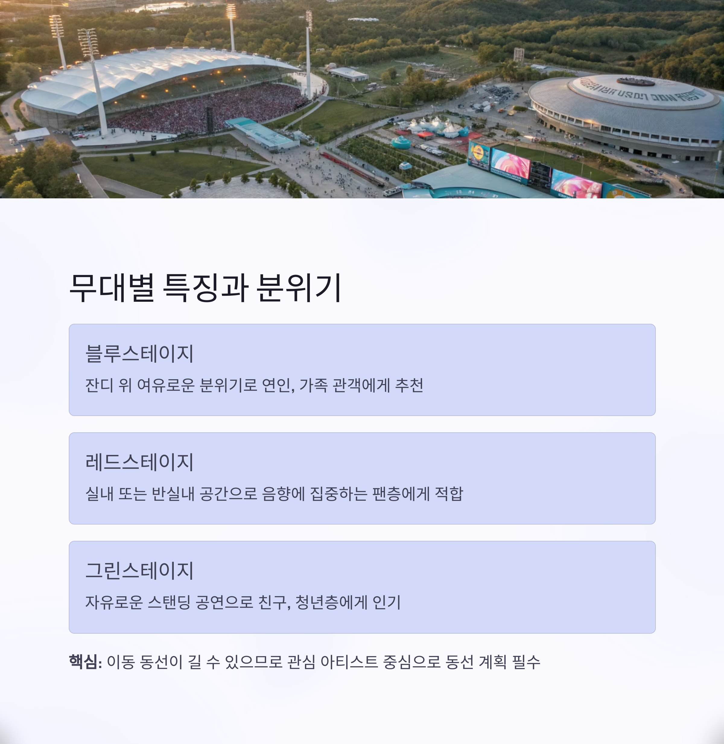 각 무대는 음악 장르, 분위기, 관람 동선이 다르기 때문에
