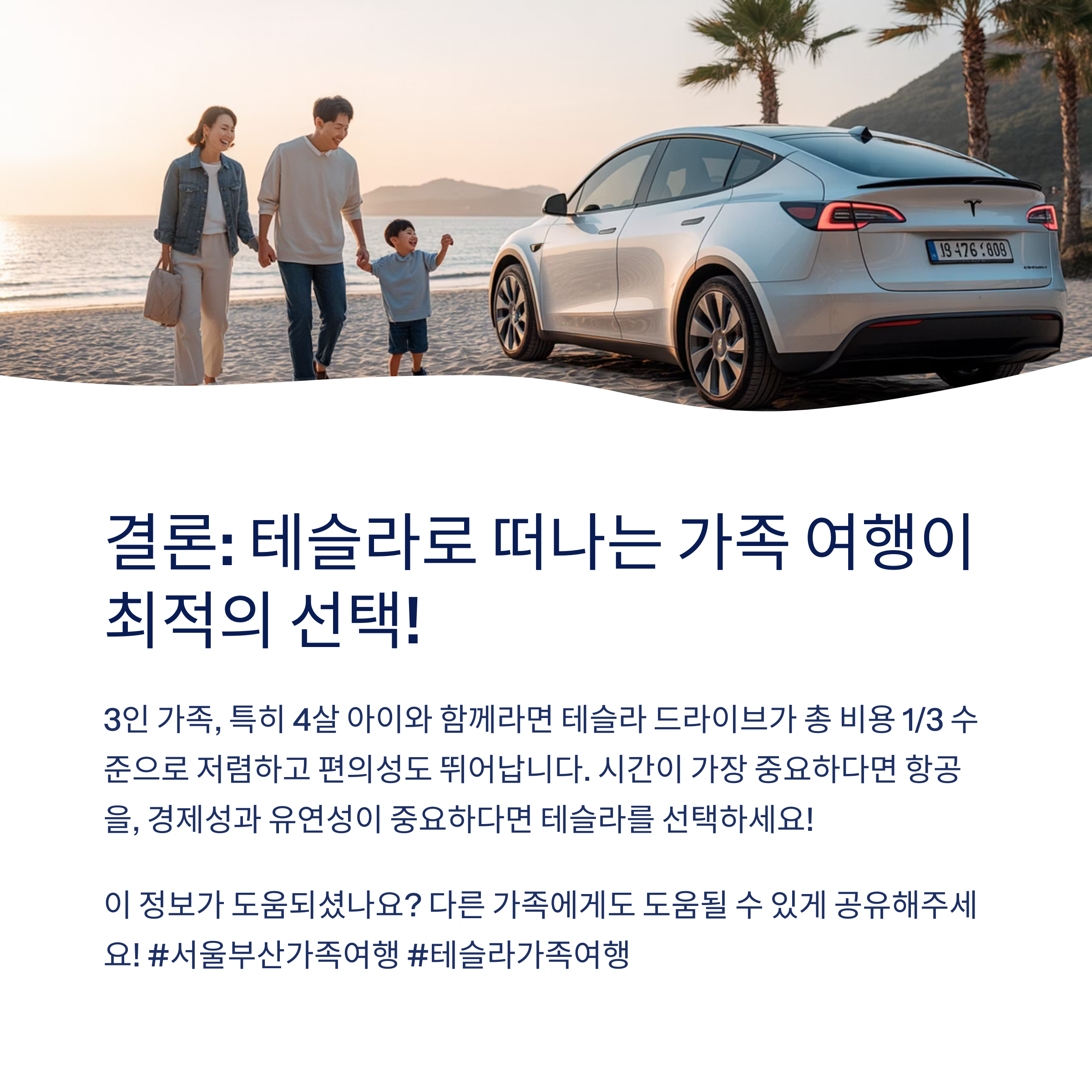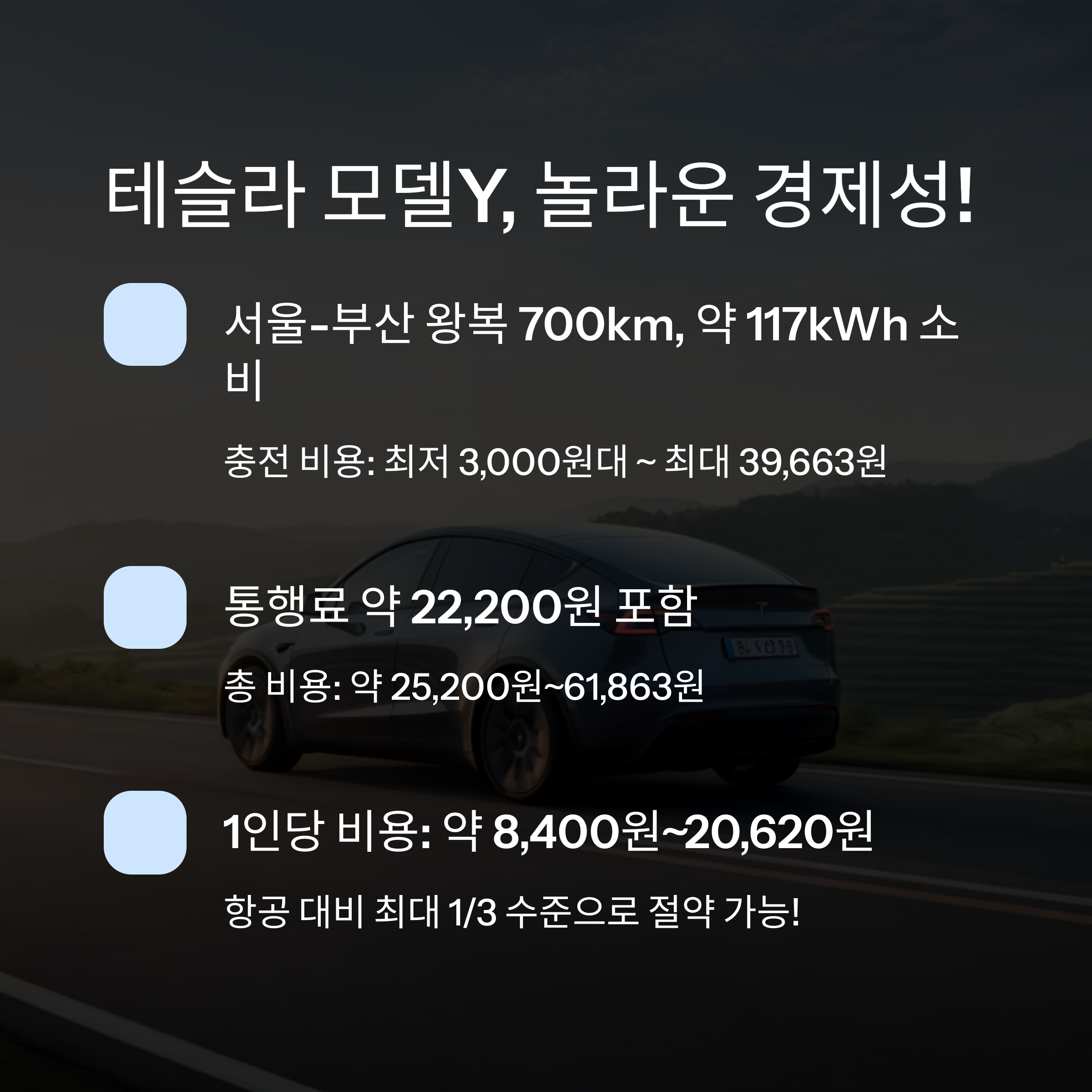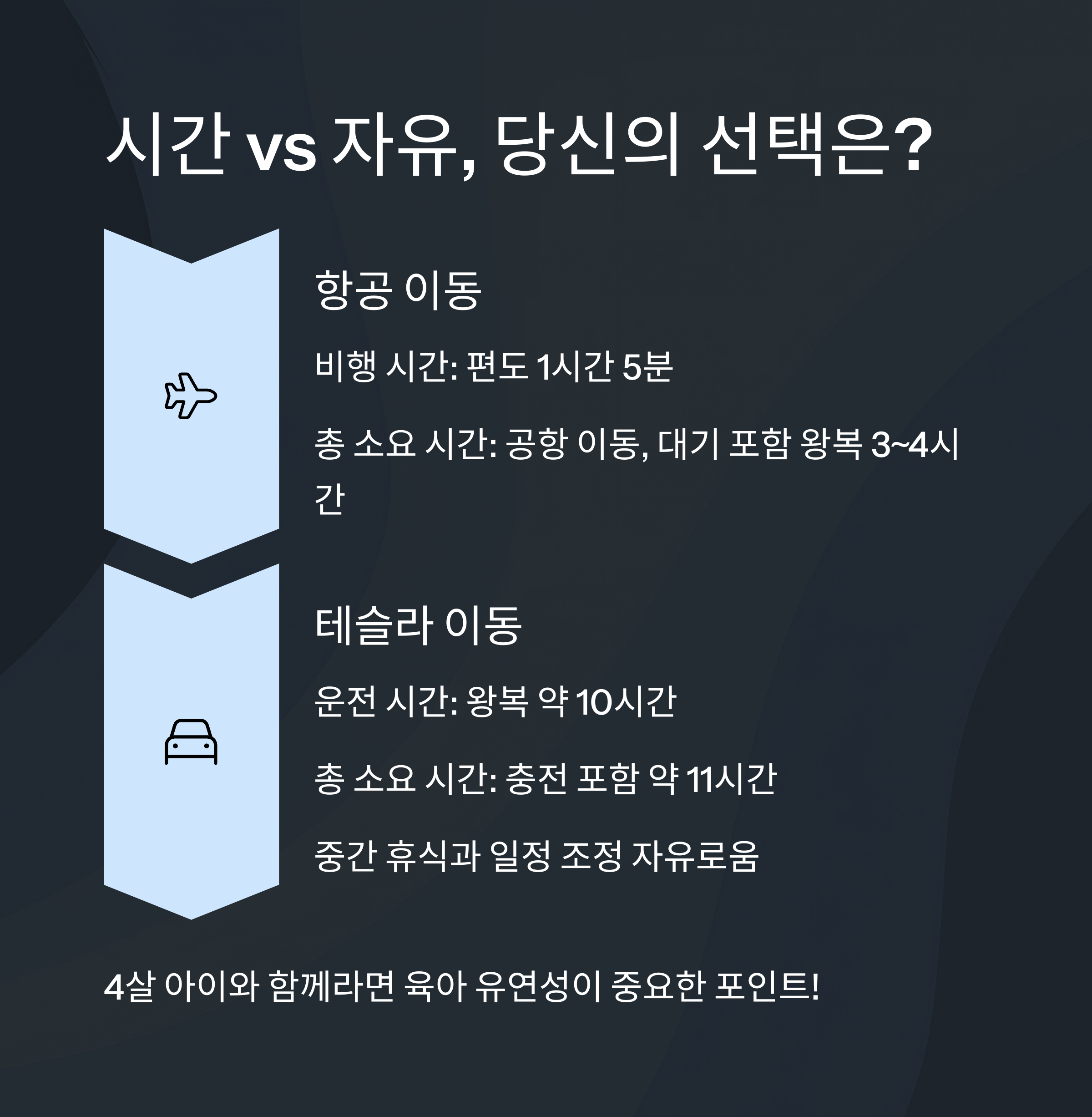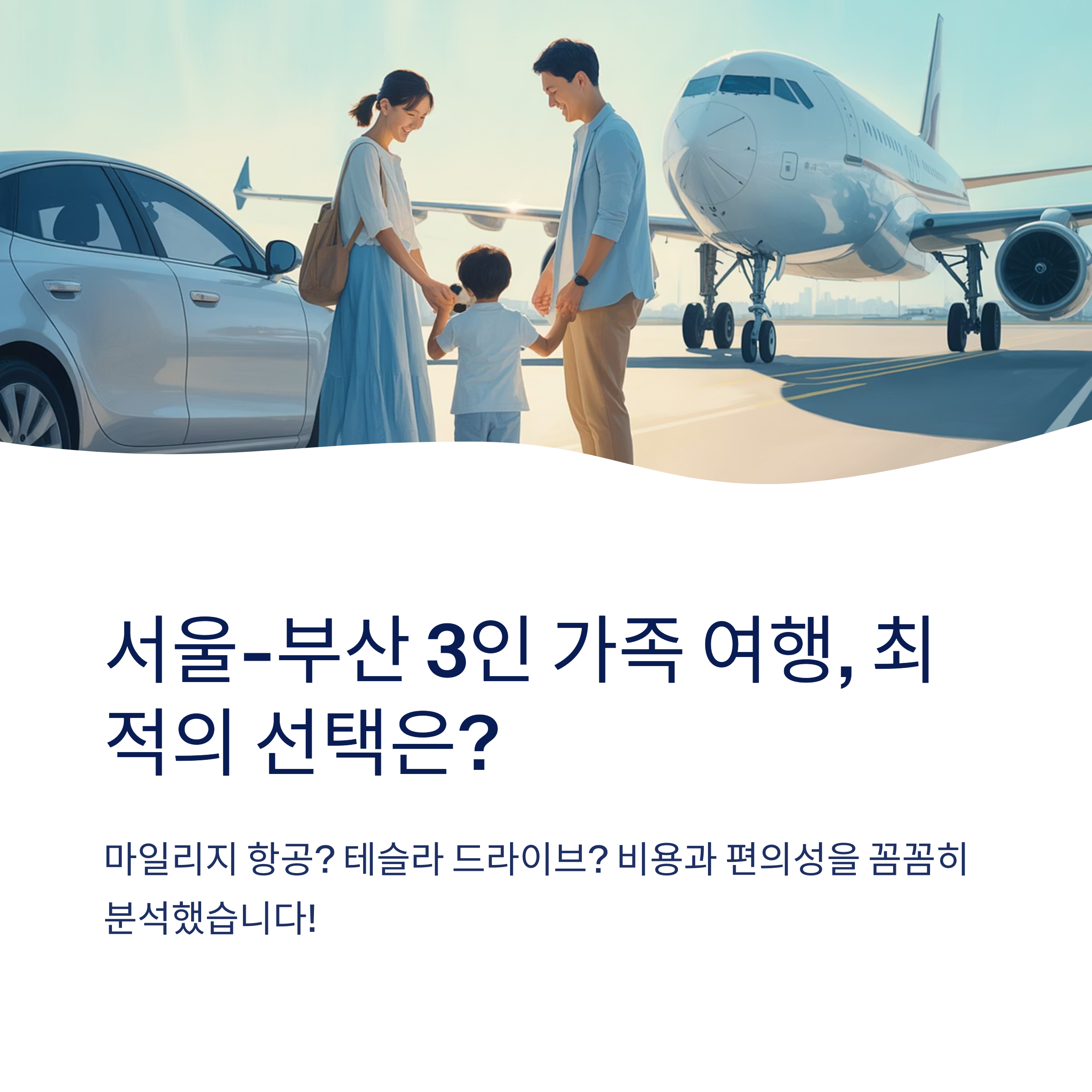 서울(김포)에서 부산까지의 왕복 여행, 3인 가족(부부+4살 아이 기준)이 선택할 수 있는 방법은 항공 마일리지 사용과 테슬라 모델Y 자가 운전이 있습니다. 비용, 시간, 편의성, 가족 구성 특성까지 고려해 어떤 방법이 더 유리한지 현실적인 관점에서 비교해드립니다.
