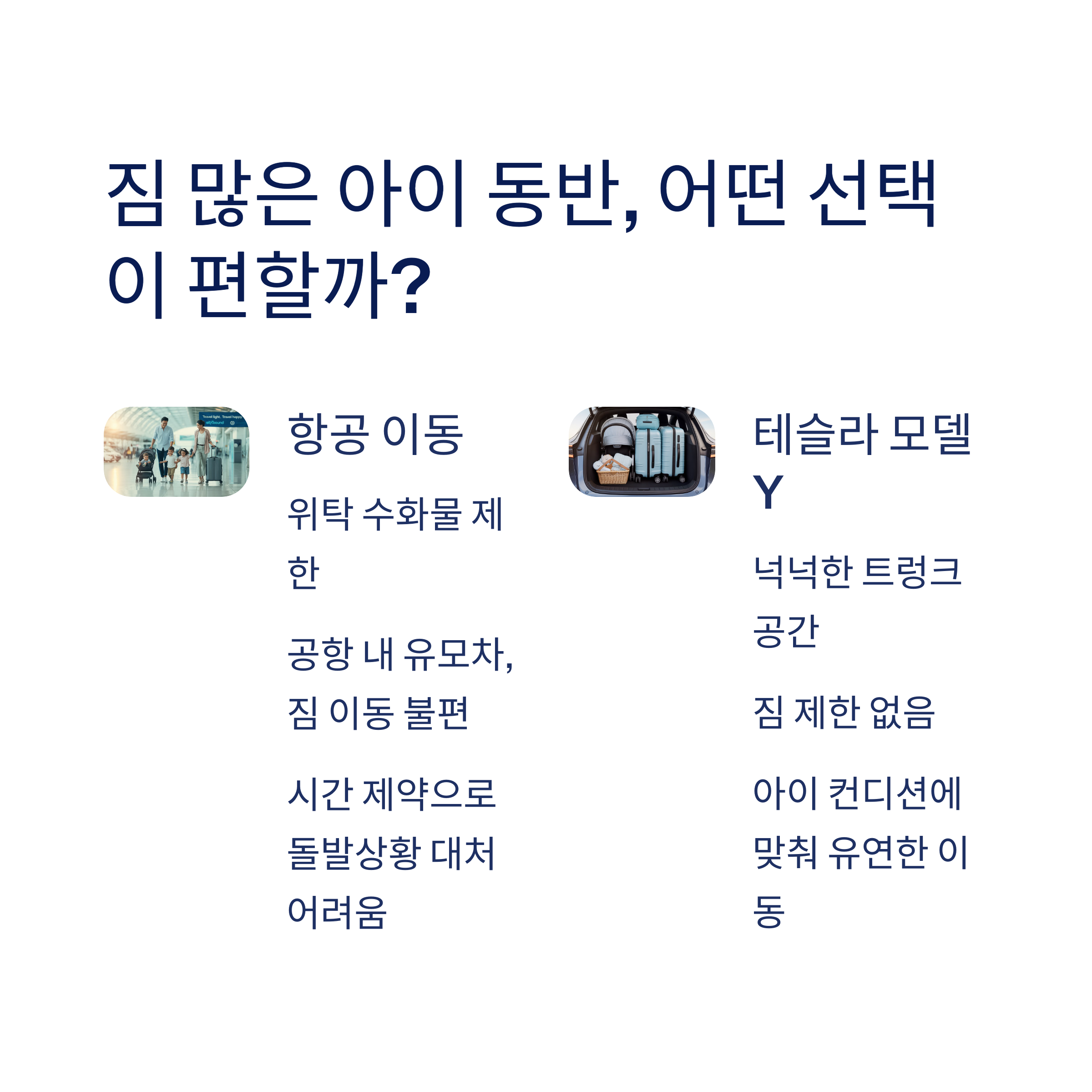 | 어린이 동반 편의성 | 공항 이동, 대기 불편 | 차량 내 유동적 대처 가능 |