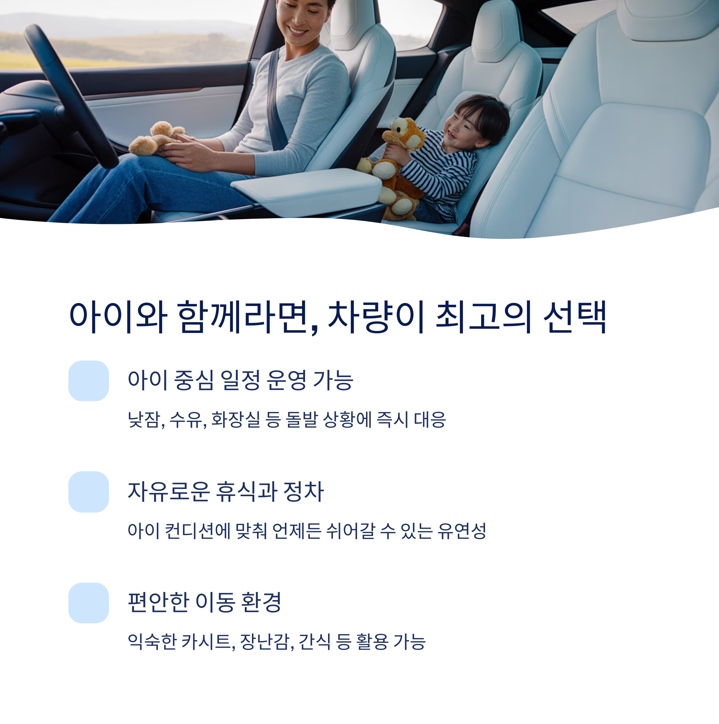 아이 동반 시 장거리 운전이 부담일 수 있지만, 일정 조정과 중간 휴식이 자유로운