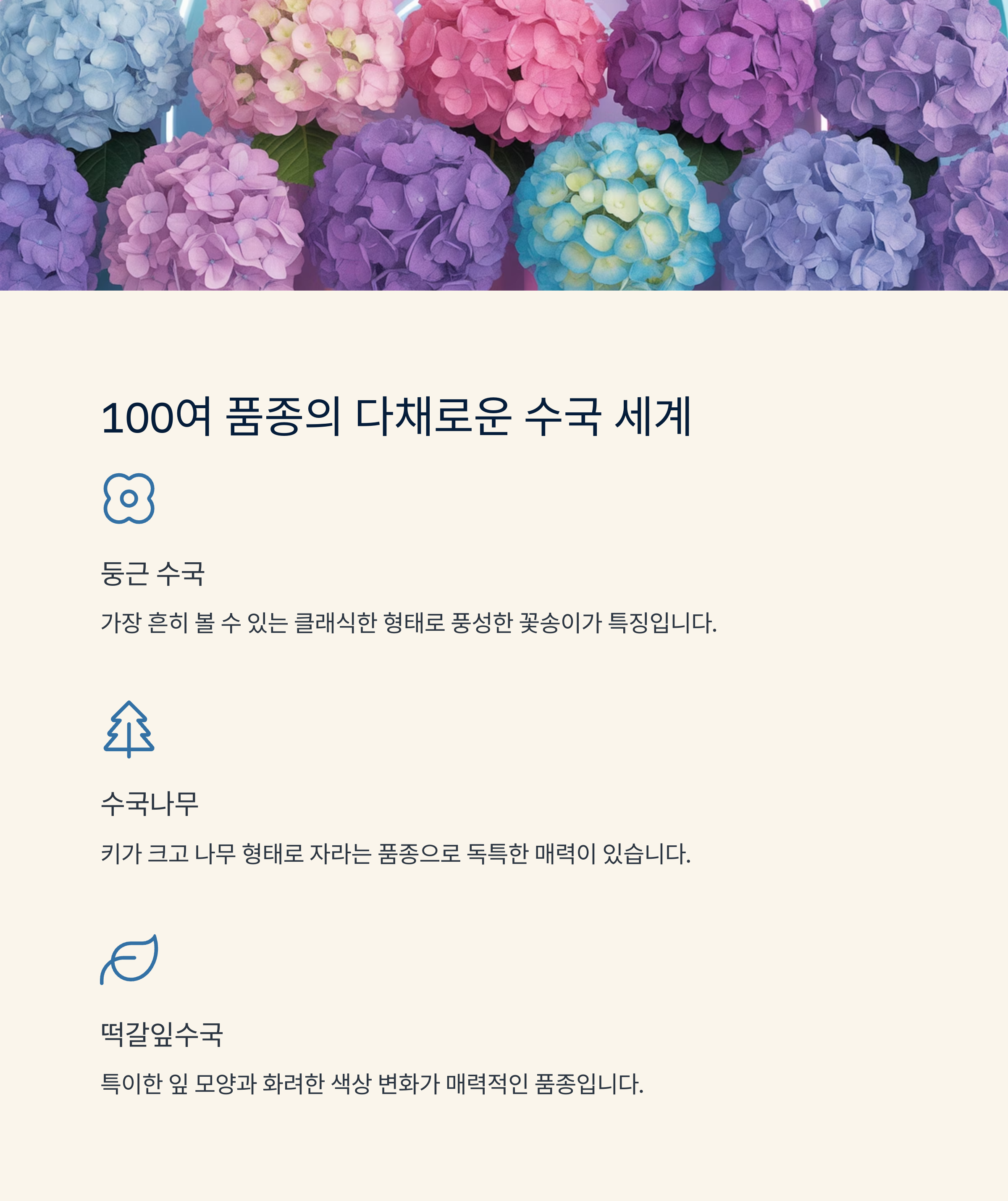 수국나무, 산수국, 떡갈잎수국 등 국내외 다양한 품종으로